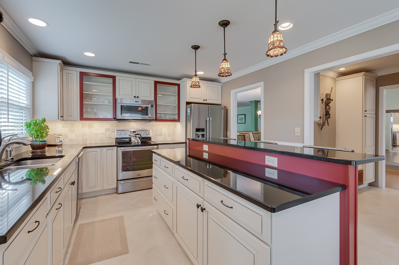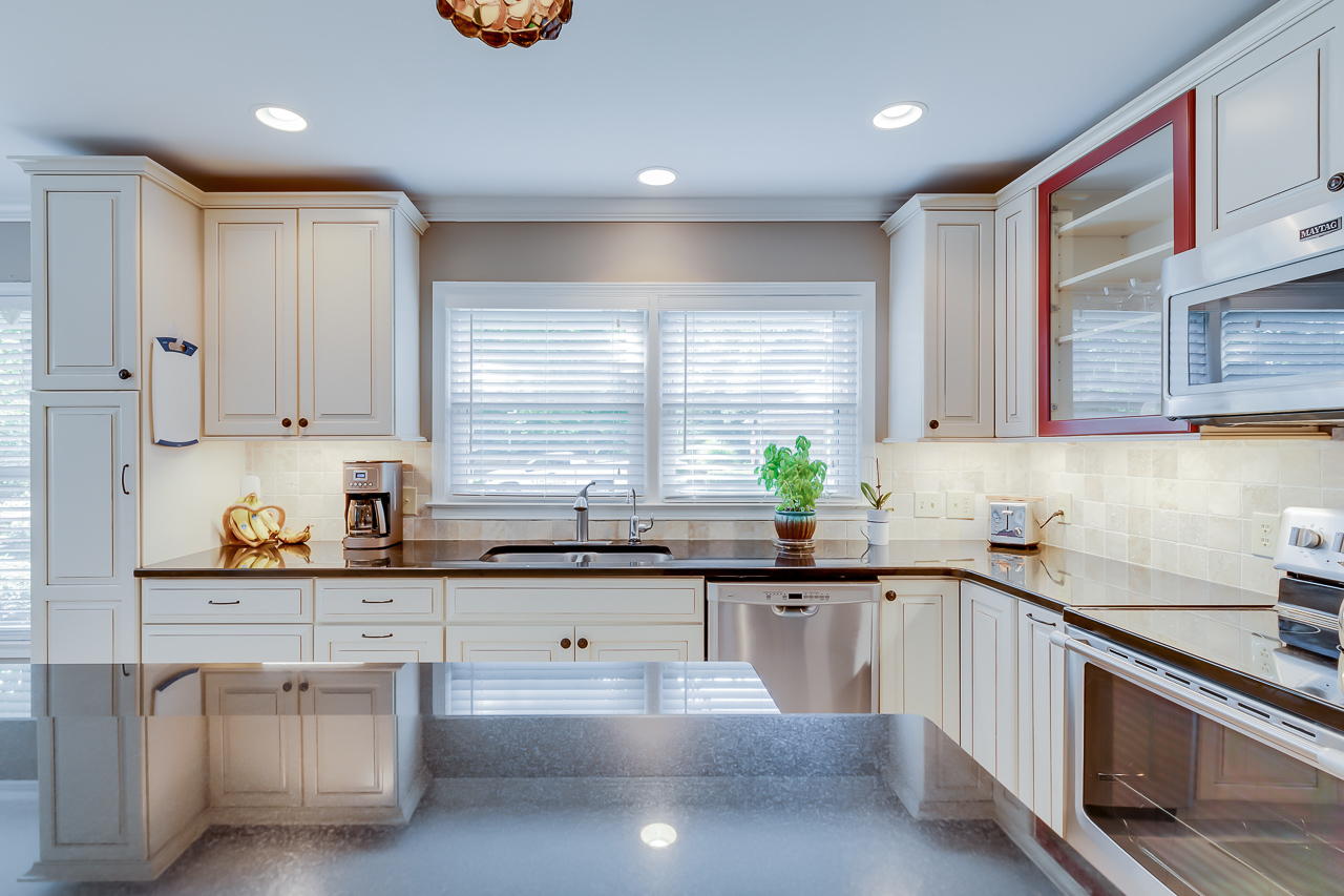 - Open kitchen gets plenty of natural light and looks out on the flowers