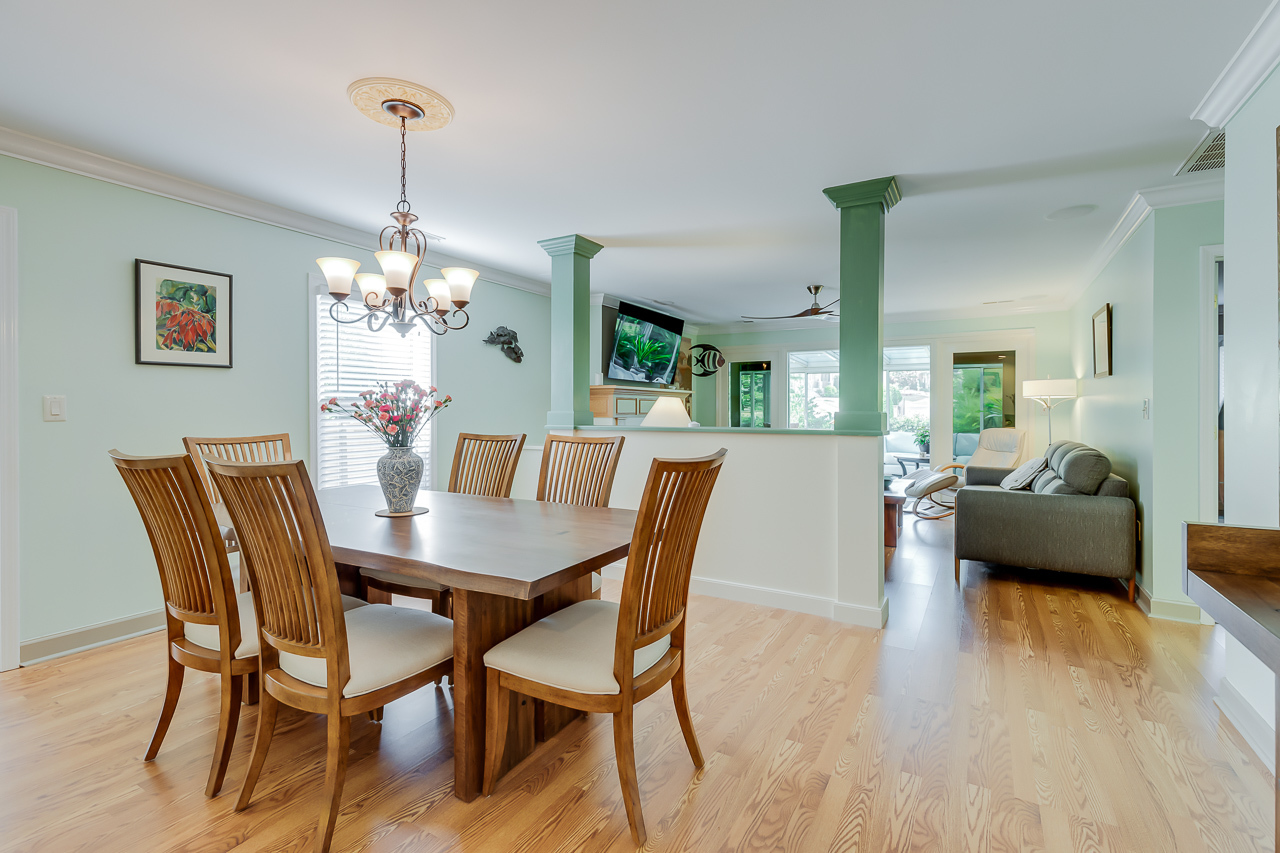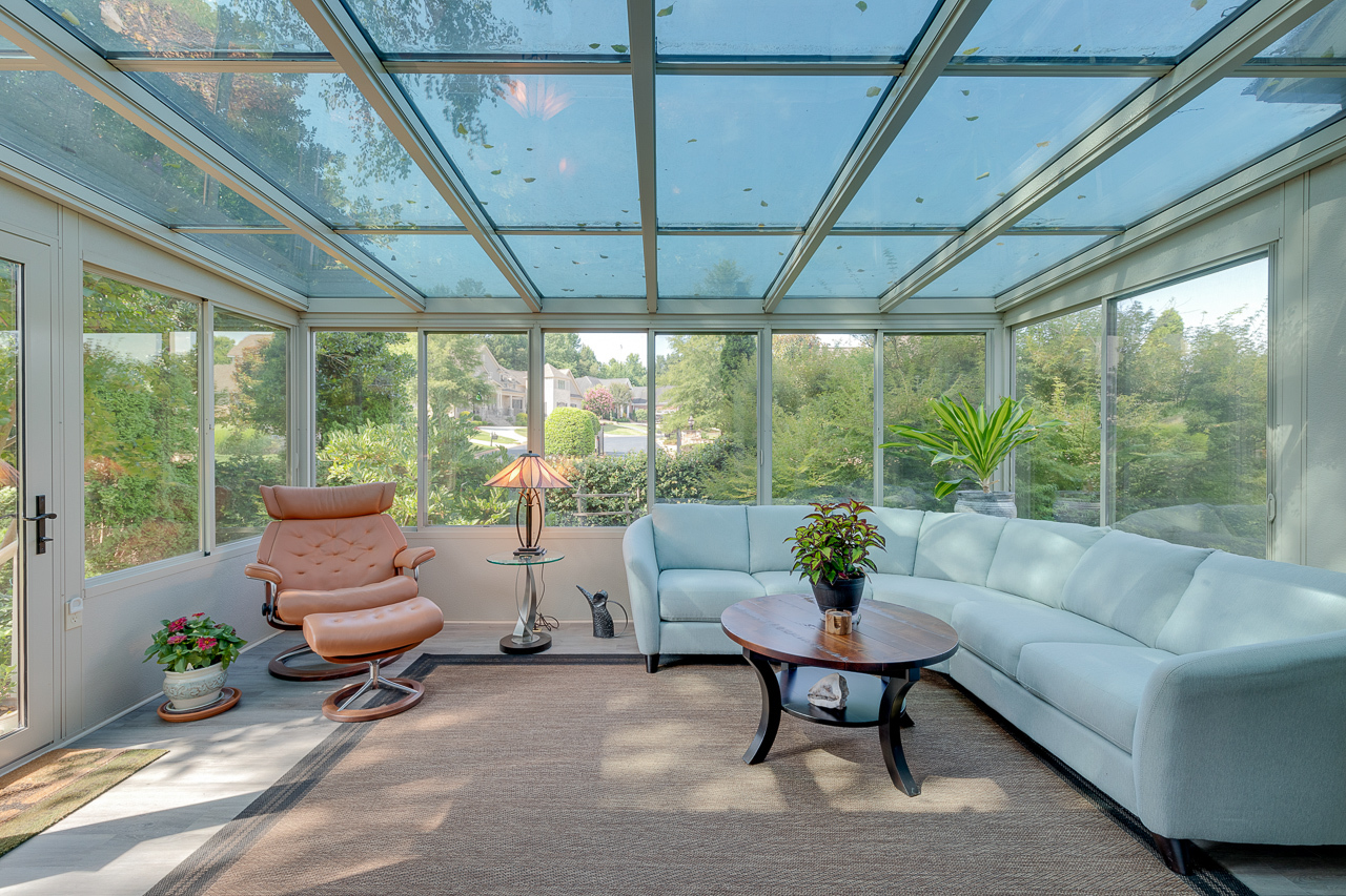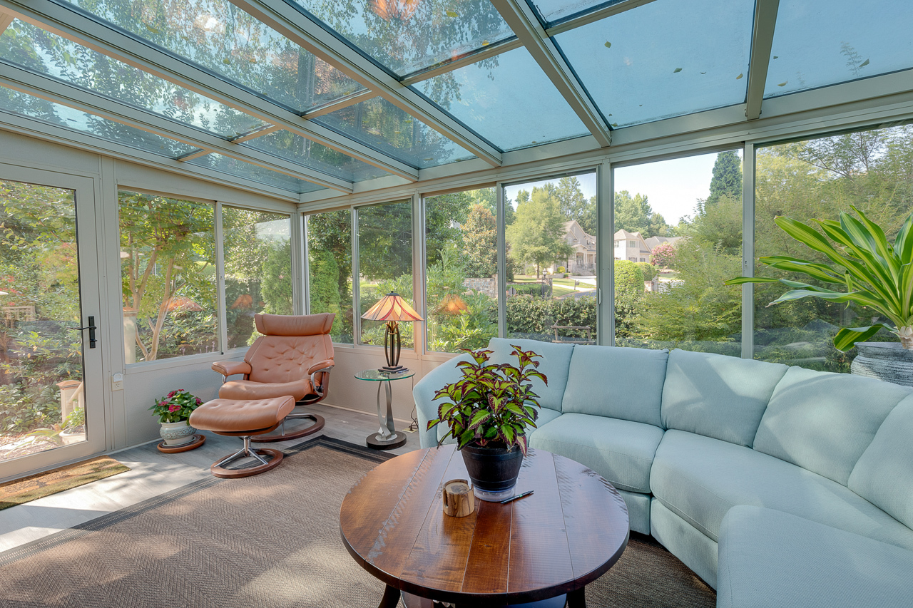 - French doors lead from the living room to the cozy and charming all-season room