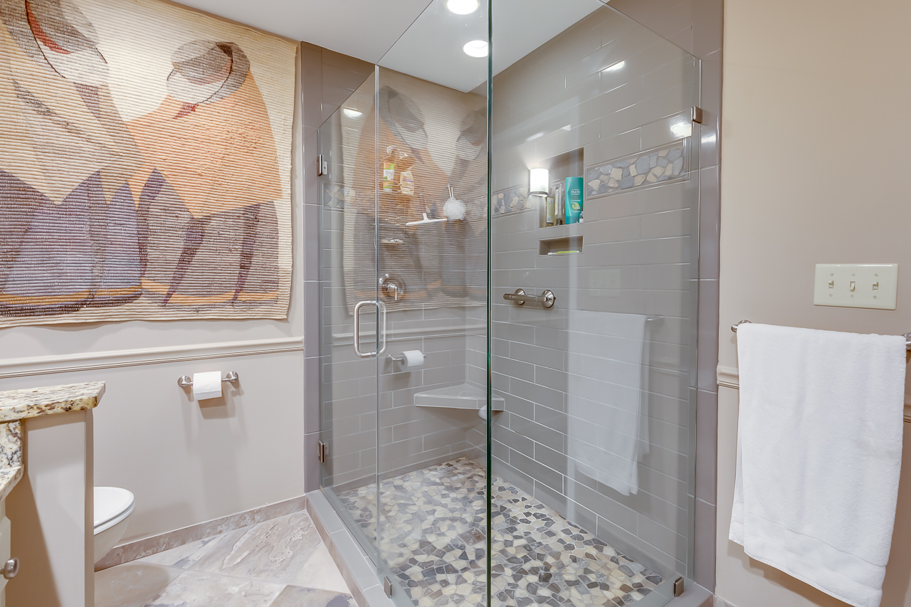 - Master bath and the second bath are updated with large tiled showers with frameless shower doors, granite countertops, tiled floors and shower walls
